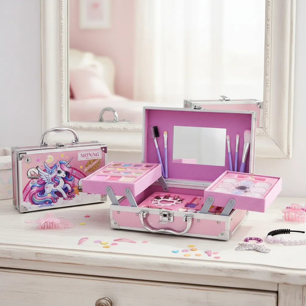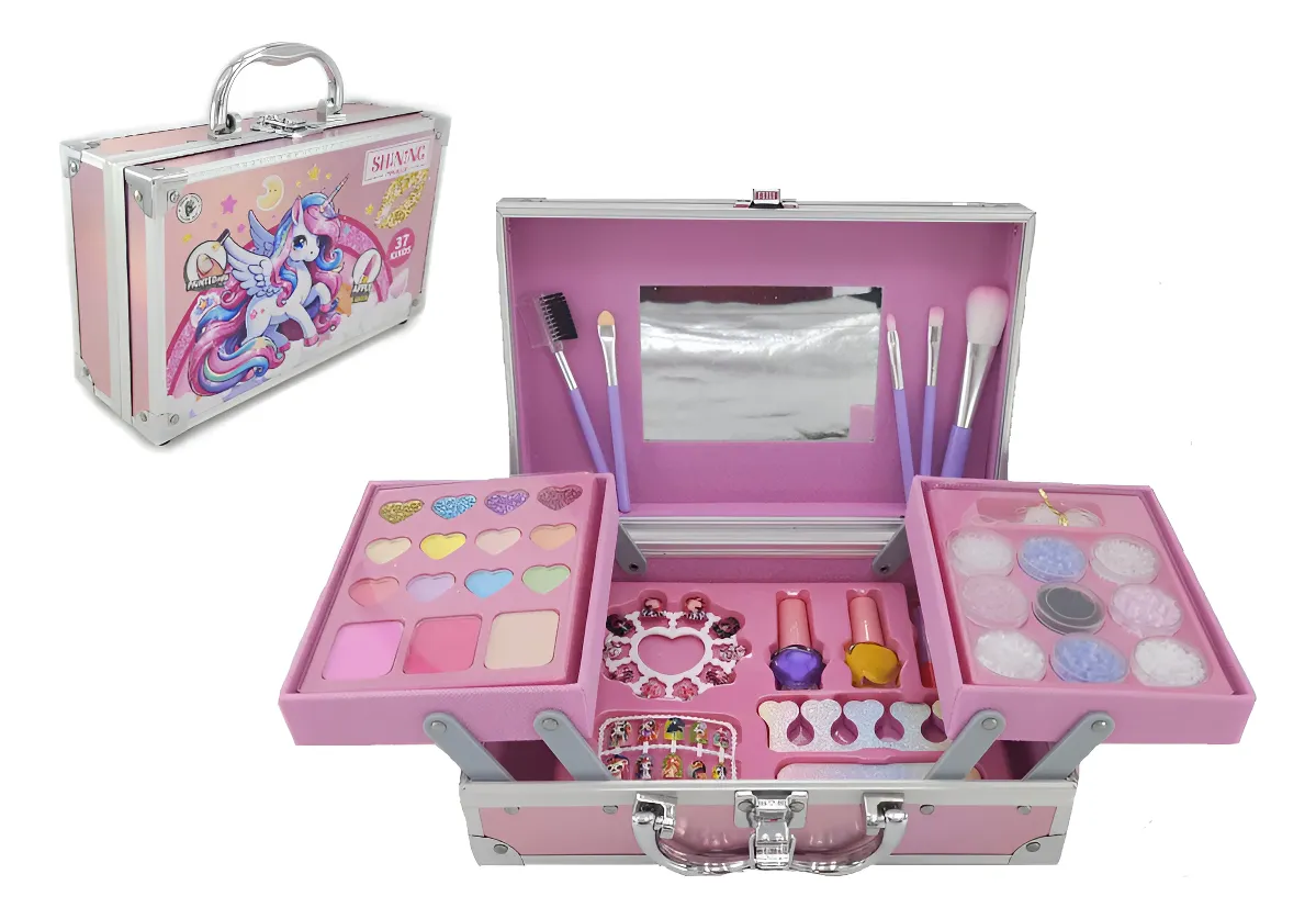 Set de maquillaje infantil de unicornio, que viene en una caja metálica portátil. El kit está diseñado para niñas y generalmente contiene una variedad de artículos de maquillaje y herramientas para jugar.